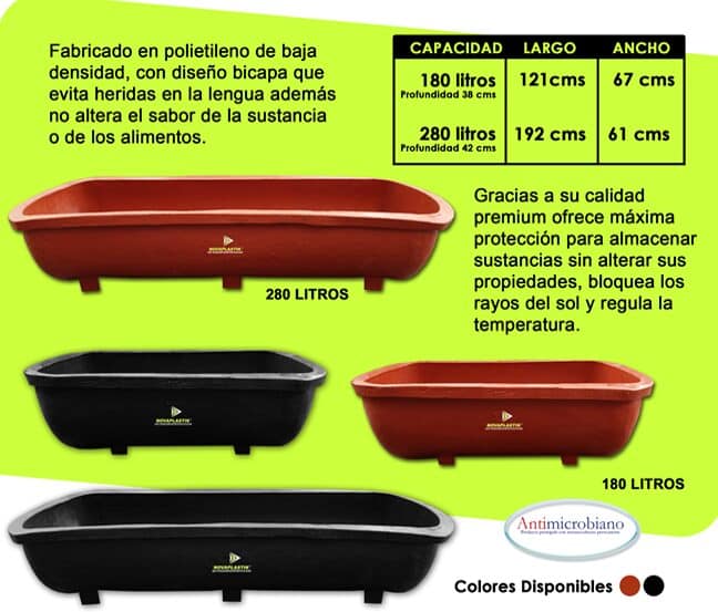 - Diseño bicapa que evita heridas en la lengua del ganado y no altera el sabor de los alimentos o del agua.